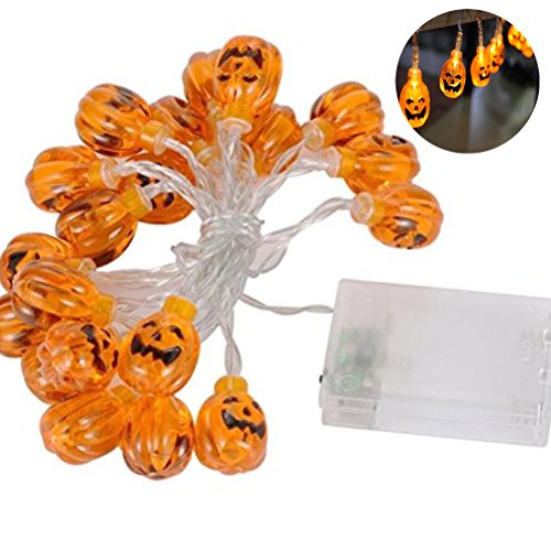 -. Feature : Convenient: Lightweight,flexible and portable. Do not require a plug,easy to store and hang in any place. / Design: Pumpkin shape design,every jack-o-lantern has a grimace on it. It uses 3 AA batteries and it has 2 different modes. Flashing and steady.(Batteries not include). A total of 20 pumpkin string lights. Easily to build a scary festive atmosphere. / Safe: For indoor and outdoor use,safe and waterproof, good heat radiation and never go hot. A soft yellow light does not make your eyes uncomfortable, to protect your health. / Designed with high efficiency LED lighting source, with high brightness. Battery-operated,easy installation, stable and reliable operation, low power consumption with a long service time. / Application: Perfect decoration for Halloween Cosplay theme parties, carnival, festival, Christmas and special occasion, can be used in shopping mall, bar, night party. Add a festive look to your Halloween Family Friends Party.