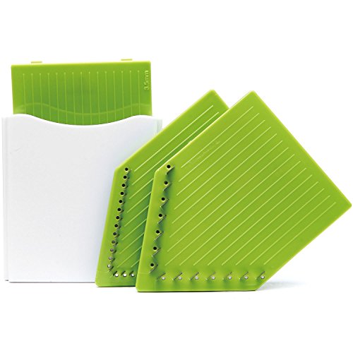PERFECT ROUND SLICES & JULIENNE slices for better cooking results. Comes with 4 blades... 3X3mm & 6X6mm grater & the 1.5mm & 3.5mm V-BLADE. The Best cucumber slicer, carrot slicer, onion slicer, tomato slicer, French Fry slicer and fruit slicer. See our reviews and images for confirmation.