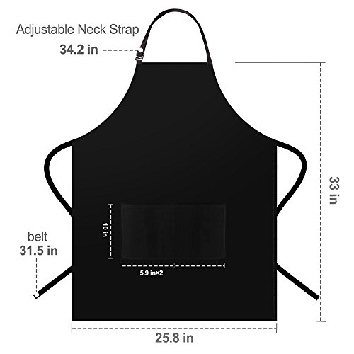 - PERFECT SIZE WITH ADJUSTABLE STRAP FOR ALL BODY TYPES: Measuring 33’’ in length and 26’’ in width, this Black Chef Apron coming with an adjustable neck strap and 2 extra long waist ties (31.5’’ each) is an one-size-fits-all type for both men and women of any body shapes.