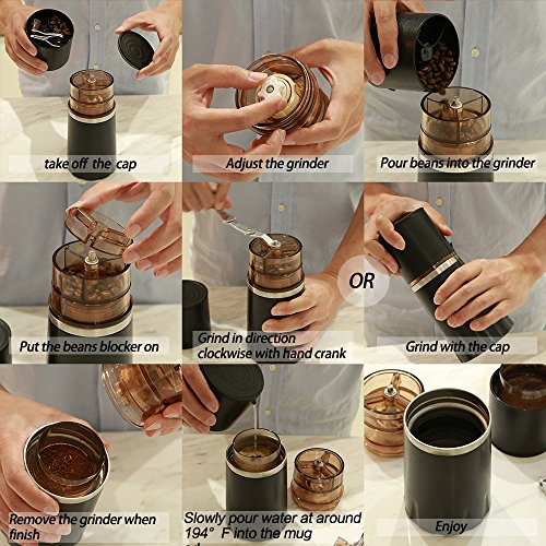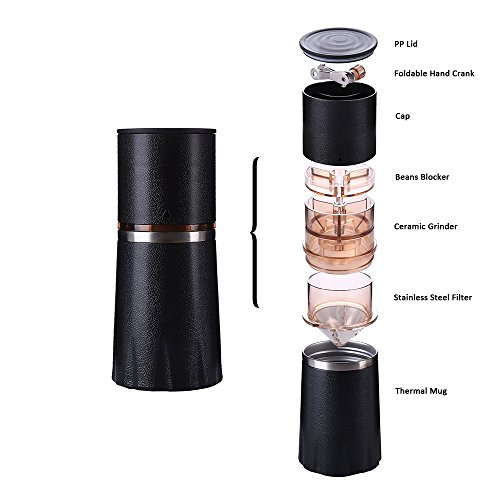 GRINDER & BREWER ALL IN ONE DESIGN, coffee beans container, kettle (130ml) , manual coffee grinder & thermal mug (260ml) all in one, allows you to enjoy fresh coffee anywhere you want