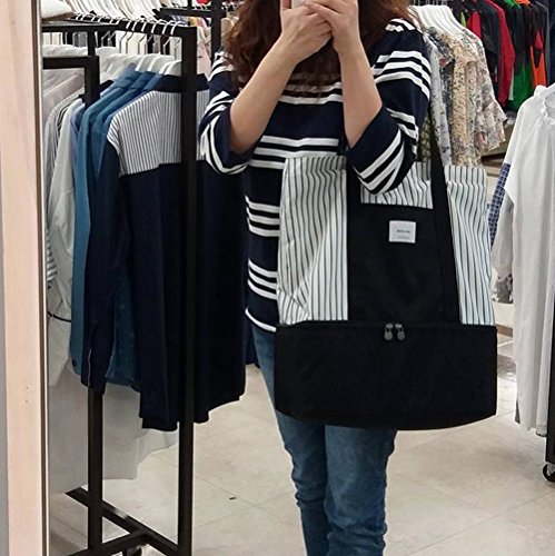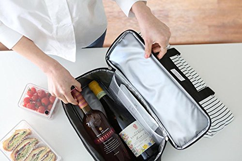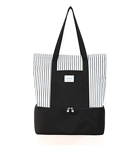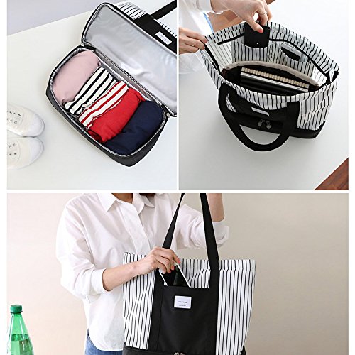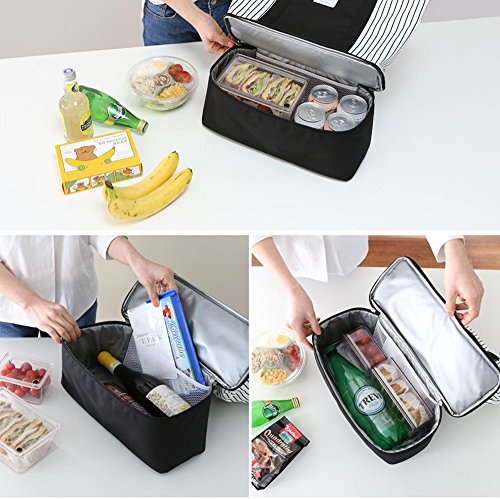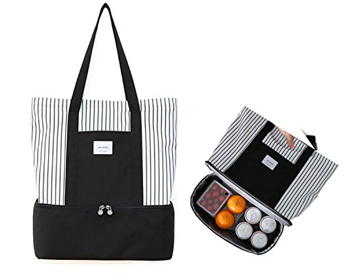 Insulated Lunch Tote Bag for Women Ladies 2-in-1 Large Trendy Zippered Stripe Tote Bag Shopping Bag Shoulder Bag Black White