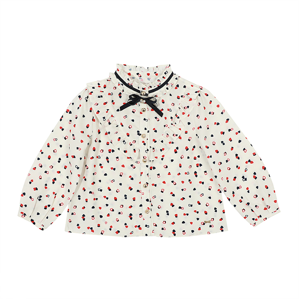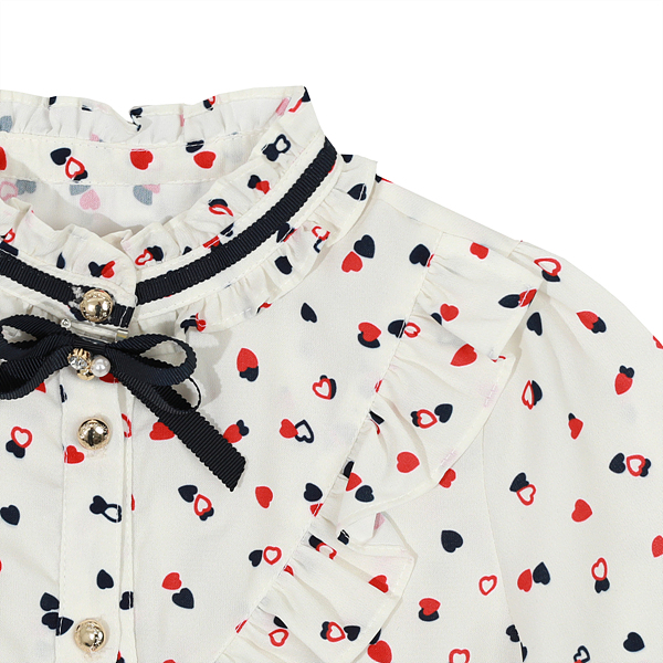 상세설명-귀여운하트패턴의 아이보리 브라우스로에리프릴과 가슴프릴이 포인트인 아이템으로 탈부착브로찌가 구성되어있습니다.