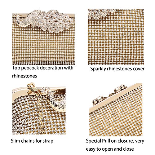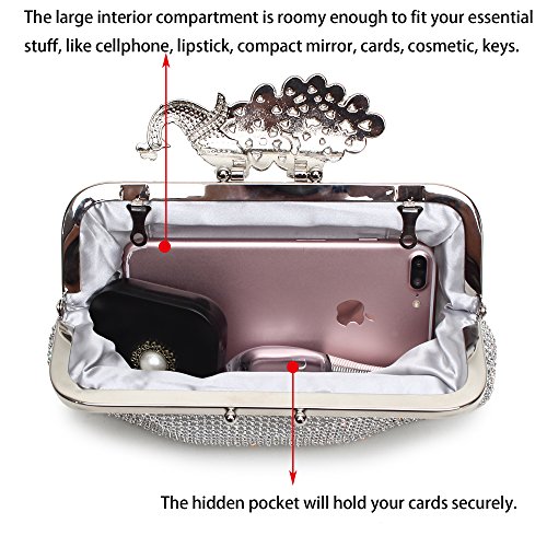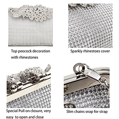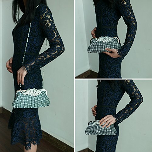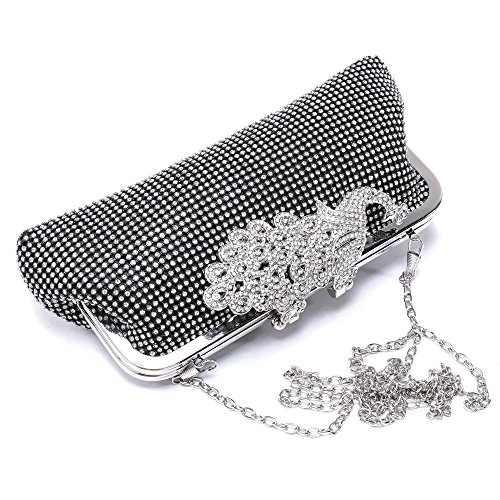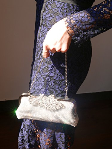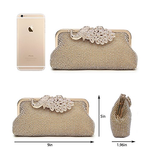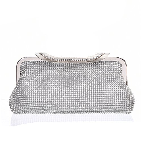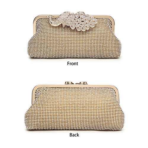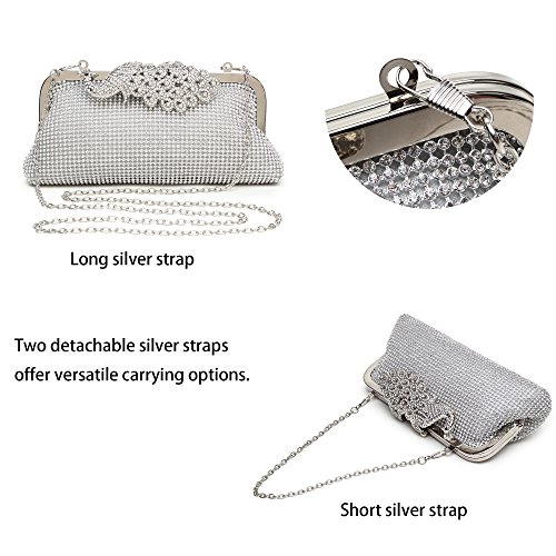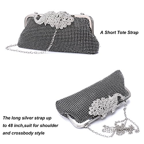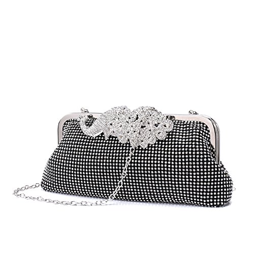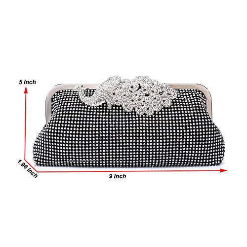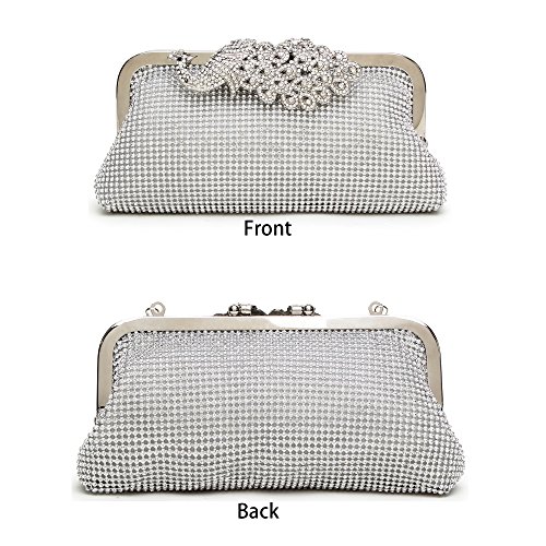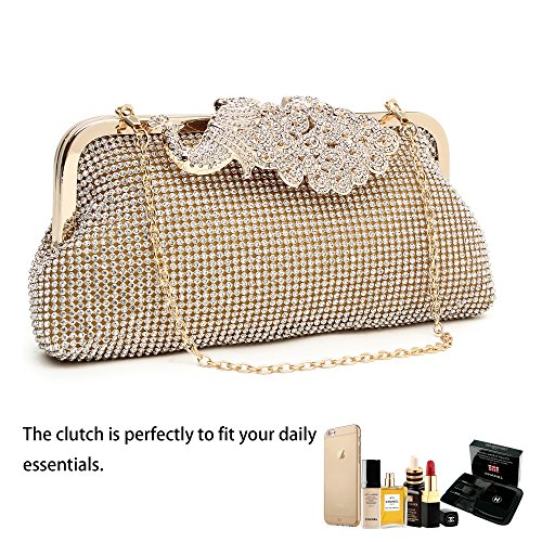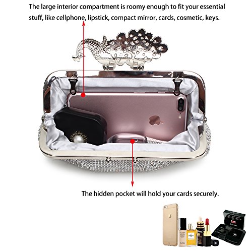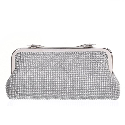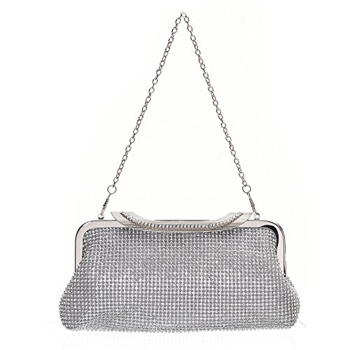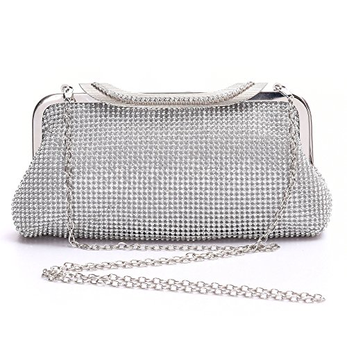 Product Description The glamorous evening party clutch features allover sparkling crystals on the front of this chic shaped clutch and has metal frame construction with clasp on the top. It features magnetic hasp closure and detachable chain which offers versatile carrying options as handbag, clutch, a shoulder bag or a cross-body bag. The crystal handbag is so royal, noble and brilliant that it will be a perfect status symbol and a bold gift for femininity.