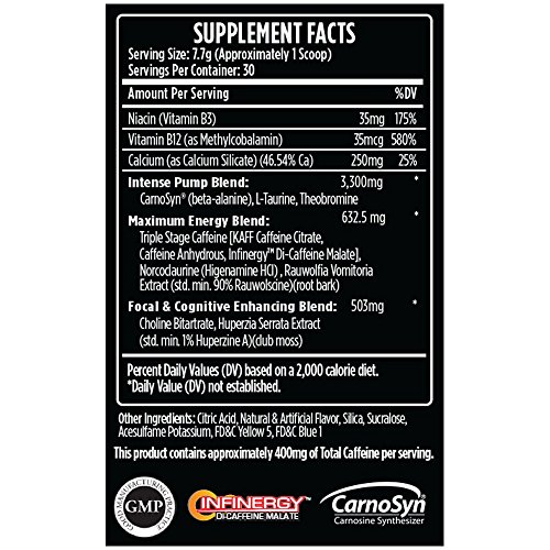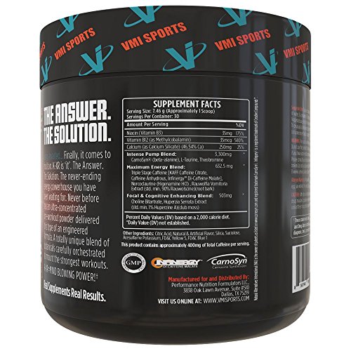 Studio : VMI Sports Publisher : VMI Sports Binding : Health and Beauty Product Description KXR IS THE ANSWER. THE PRE-WORKOUT SOLUTION YOU HAVE BEEN LOOKING FOR. ALL THE ENERGY, ALL THE POWER, WITHOUT THE CRASH. NO JITTERS, NO HEADACHES, POWERED BY: CARNOSYN® Beta Alanine: An amino acid that supports muscular endurance. Beta Alanine produces a tingly sensation throughout the body that lets you know it's working. INFINERGYTM di-caffeine malate: a time released version of Caffeine that allows for longer energy release and superior workouts. A unique blend of botanical ingredients that will help provide a maximum intensity pre-workout formula to have you setting new records in the gym! With improved focal enhancement, sustained energy release and increased pumps endurance, KXR will make sure you never look to another pre-workout again! 0