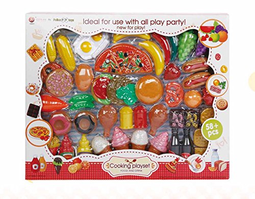 -. Feature : Ideal for use with all play party, perfect for children pretend play game. / Adorable design in bright colors to keep kids engaged and entertained. / Cooking playset with food and drinks, includes 58pcs accessories, a combination of pizza, fruits, biscuits, icecream, drinks and etc. / Encourages fine motor skills development, promotes children's imagination and creativity. / Makes a great children gift. Recommended for ages 3 years and up.