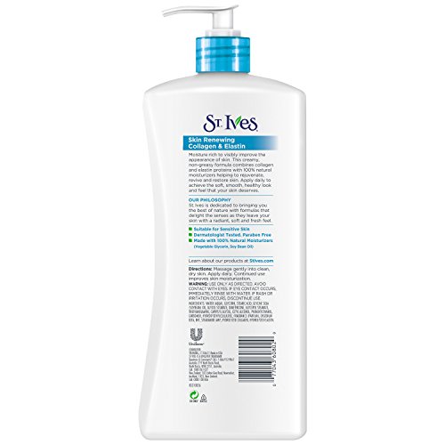 Studio : St. Ives Publisher : St. Ives Binding : Health and Beauty Product Description Youthful skin is always in! Wrap your body in this rich, renewing lotion for beautiful, supple skin.Made with 100% natural moisturizers (soybean oil and plant based glycerin) this non-greasy lotion absorbs quickly to give your skin a helping hand in times of need. Be sure to layer on once a day, and your skin will thank you for it. Who knew soybeans had natural moisturizing properties? Well we did actually. That’s why we put it in our lotions. Soybean oil is a real smoothie, gliding onto the skin and soaking right in. Our soybeans come from the fields of the USA, and nothing else sneaks in during the extraction process - our soybean oil is as nature intended; 100% natural. If you love this, try our bigger size of lotion so that’s’ even more of our revitalizing formula (with 100% natural moisturizers) to smooth on skin all day long… Natural Ingredients: Moisturizing soybean oil Tell me more! Our Renewing Collagen Elastin Body Hand and Body Lotion is suitable for sensitive skin, paraben free, and dermatologist tested. How to use: Squeeze 1-2 pumps of lotion into your palms spread all over body. Rub in small circular motions with gentle pressure to awaken your skin. Use daily to give your skin that TLC it deserves! 0