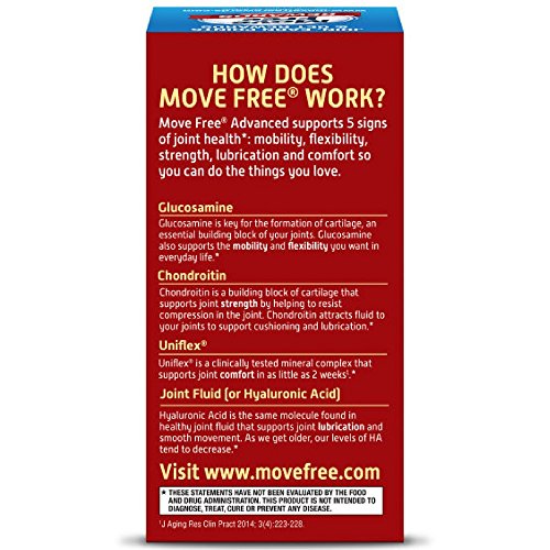 Move Free Advanced is a Glucosamine Chondroitin joint supplement that contains premium ingredients, including glucosamine, chondroitin, uniflex (calcium fructobrate), and hyaluronic acid, to promote the health of your joints. Glucosamine is key for the formation of cartilage, an essential building block of your joints to support your mobility and flexibility.* Chondroitin is a building block of cartilage that supports joint strength by helping to resist compression in the joint. Chondroitin attracts fluid to your joints to support cushioning and lubrication.* Uniflex (calcium fructobrate) is a clinically test mineral complex that supports joint comfort in as little as 2 weeks.** Hyaluronic Acid is the same molecule found in healthy joint fluid that supports joint lubrication and smooth movement. As we get older, our levels of HA tend to decrease.* *These statements have not been evaluated by the Food and Drug Administration. This product is not intended to diagnose, treat, cure or prevent any disease. **J Aging Res Clin Pract 2014; 3(4):223-228Feature