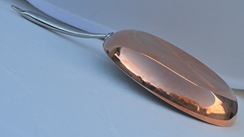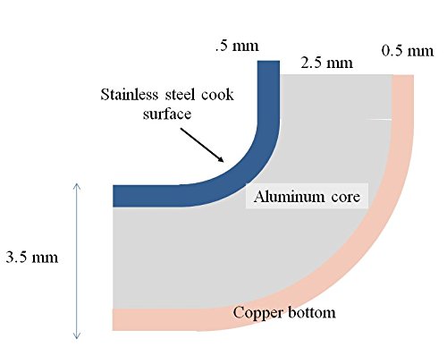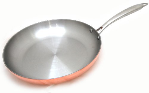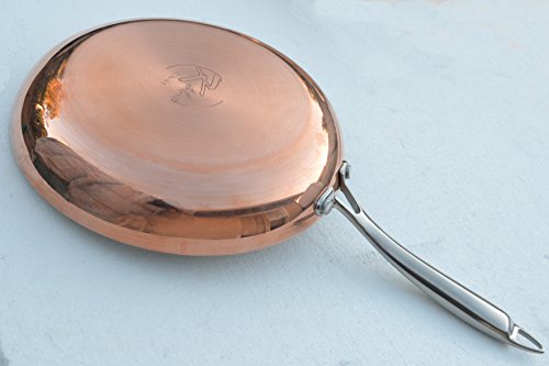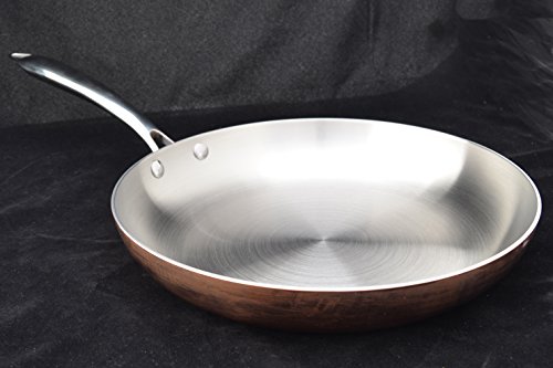 The new design uses more copper. The highlight of our frying pan is the 3.5 mm thickness. The copper exterior is 0.5 mm, the aluminum core is 2.5mm and the stainless steel interior is 0.5mm. Home chefs that love conduction in their pan will cherish this everyday use item. The aluminum core is a good compromise (over copper ore). This pan will heat quickly on the stove but also cool fast to prevent burning. The 11-inch frying pan excels in browning meats and for sautéing vegetables. Our pan has a 2" sloped side for easy stirring. The classic elegance of the copper bottom will tarnish into a heirloom tarnished patina that has been cherished by mankind for ages. Brighten up your life with the glow of copper.. The stainless surface interior is easy to clean and is neutral. This pan requires very little oil and promotes healthy cooking. Delicious gourmet entrees promote small helpings and cut down on caloric intake. The pan cleans easily. Ergonomic riveted handles allow for robust use.Feature
