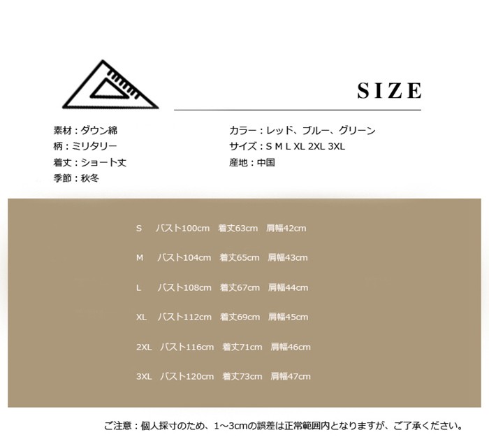 ダウンベスト メンズ ショート丈 ミリタリージャケット ダウン綿コート 中綿ベスト メンズ アウター 羽織 カジュアル 大きめ 2018秋冬新作 中綿ベスト メンズ アウター ダウンベスト メンズ ショート丈商品詳細素材:ダウン綿柄:ミリタリー着丈:ショート丈季節:秋冬カラー:レッド、ブルー、グリーンサイズ:S M L XL 2XL 3XL産地:中国サイズ参照表S バスト100cm 着丈63cm 肩幅42cmM バスト104cm 着丈65cm 肩幅43cmL バスト108cm 着丈67cm 肩幅44cmXL バスト112cm 着丈69cm 肩幅45cm2XL バスト116cm 着丈71cm 肩幅46cm3XL バスト120cm 着丈73cm 肩幅47cmご注意:個人採寸のため、1~3cmの誤差は正常範囲内となりますが、ご了承ください。ダウンベスト メンズ ショート丈 ミリタリージャケット ダウン綿コート 中綿ベスト メンズ アウター 羽織 カジュアル 大きめ 2018秋冬新作 中綿ベスト メンズ アウター ダウンベスト メンズ ショート丈