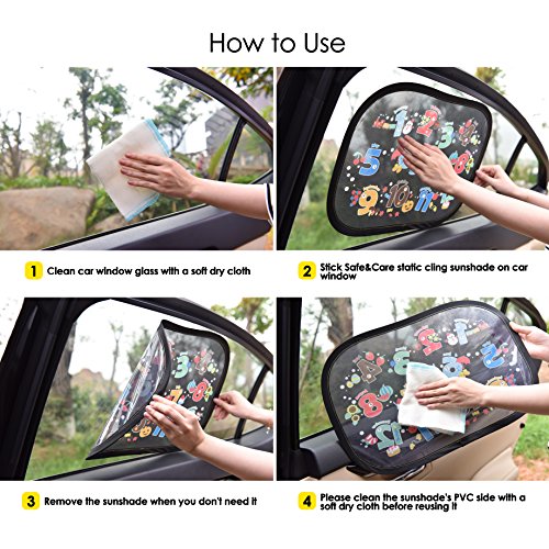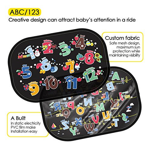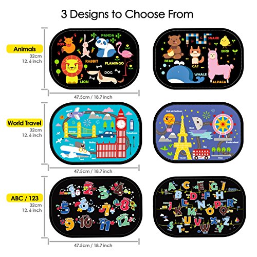 【BEAUTIFUL CARTOON DESIGN TO EDUCATE THROUGH ENTERTAINMENT】The window sunshades has 3 different patterns to choose from. These lifelike cartoon design(26 letters/12 numbers/animals/traffic road/transportation/buildings)will attract the attention of children.You can teach them to learn something new in the travel, make travel much fun by baby interaction and education.