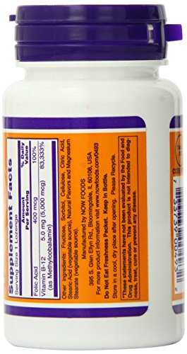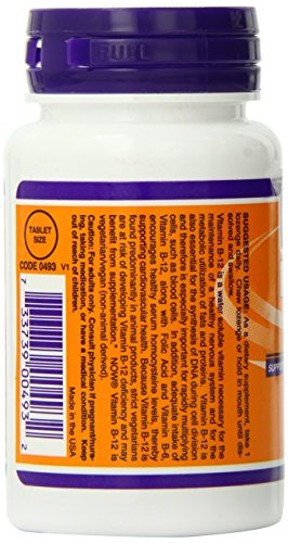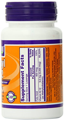 -. Binding : Health and Beauty -. Brand : Now Foods -. Department : Health and Beauty>Health and Wellness -. EAN : 0733739004932 -. Feature : Vitamin b-12 is also essential for the synthesis of DNA / Adequate intake of methyl b-12 - 5000 mcg, along with folic acid and vitamin b-6, encourages healthy serum homocysteine levels / As part of a well-balanced diet that is low in saturated fat and cholesterol, vitamin b12 may reduce the risk of vascular disease -. IsAdultProduct : 0 -. IsAutographed : 0 -. IsMemorabilia : 0 -. Label : Now Foods -. LegalDisclaimer : This information is intended for your general knowledge only and is not substitute for professional medical advice or treatment for specific medical conditions. This information is not intended to diagnose, treat, cure or prevent any disease. Always seek the advice of your qualified physician or other health care provider with any questions you may have regarding a medical condition. Keep out of reach of children. -. Manufacturer : Now Foods -. Model : 733739004932 -. MPN : 0493 -. NumberOfItems : 1 -. PackageQuantity : 1 -. PartNumber : 0493 -. ProductGroup : Health and Beauty -. ProductTypeName : HEALTH_PERSONAL_CARE -. PublicationDate : 2013-07-04 -. Publisher : Now Foods -. ReleaseDate : 2013-07-01 -. Size : 120 -. Studio : Now Foods -. Title : Now Foods Methyl B-12 Lozenges, 5000 mcg 120 Count -. UPC : 733739004932