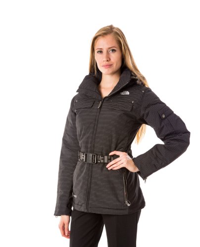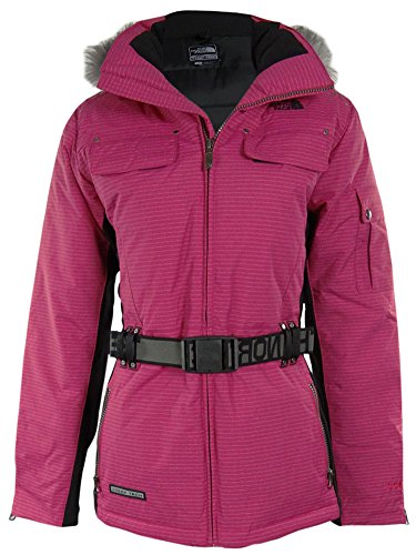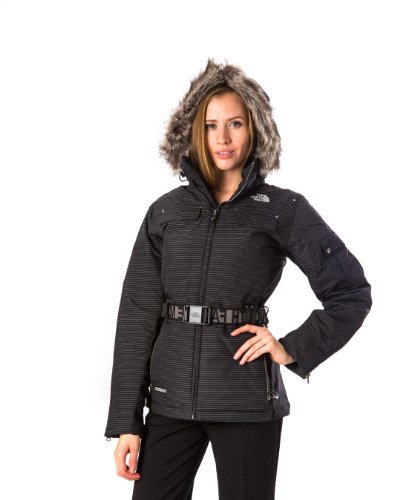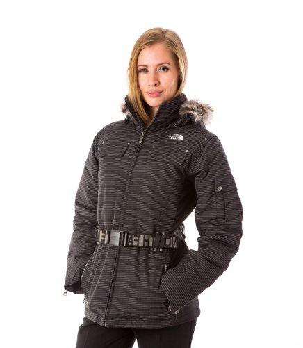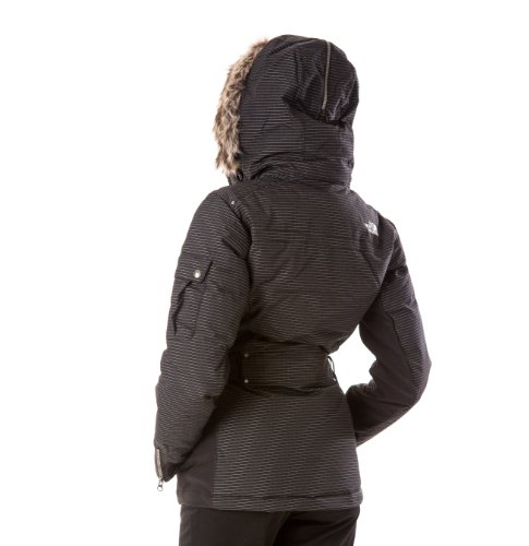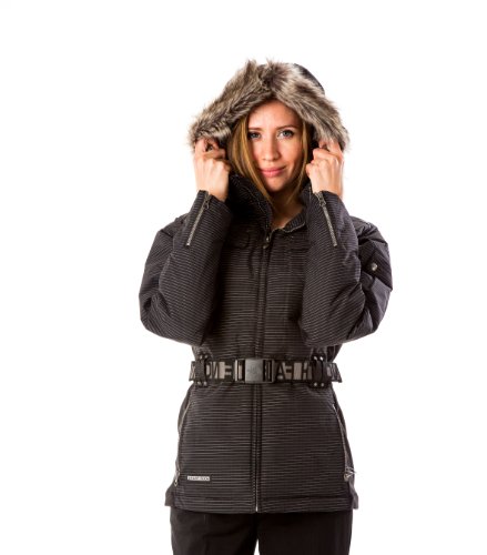 Coat features full lining, attached faux fur hood, pinstriped water & wind resistant fabric, front velcro chest pockets, side zipper pockets, buttoned sleeve pockets, goose down filling, side stretch panels belt loops (belt included), and front zipper closure.Feature