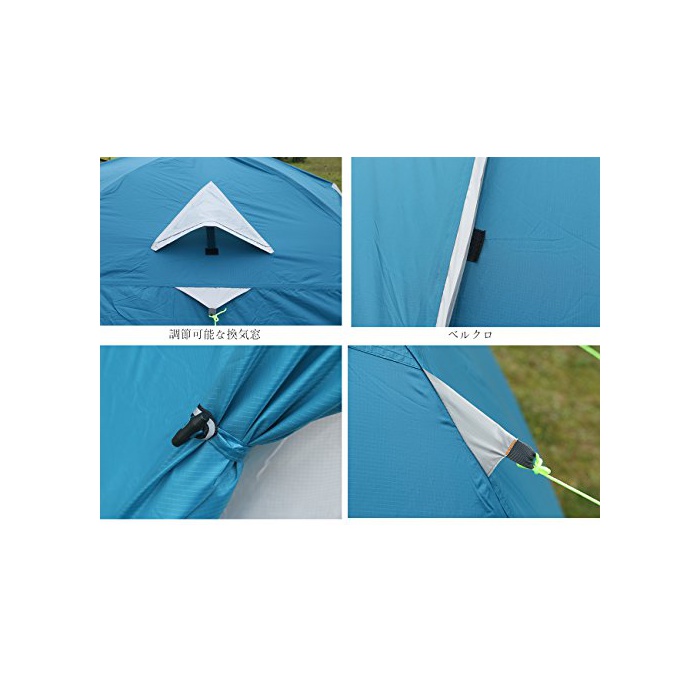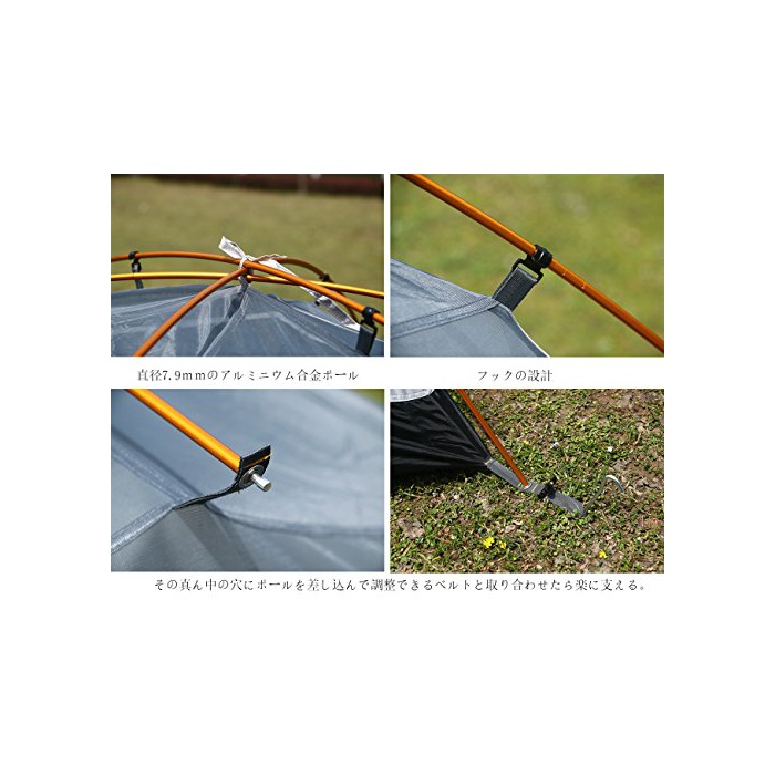 hang에 끼어 서면,폴을 차분히 사걸었다 앞으로에서 차례로 링크를 결속.텐트저의 벨트에는 금속의 구멍과 조정 할 수 있는 버튼이 있고, 폴을 통하는 것이 편리합니다.외장막과 바닥이 내수압3000MM의 도장이 있고, 거기에(게다가) 충분의 페그(말뚝)와 로프가 어느(있는) 때문에,설치를 세우는 한,호우에서도 상관하지 않는다.