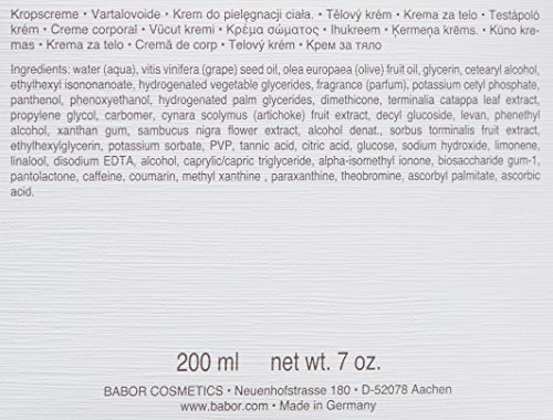 For Mature Skin. Vitamin ACE Body Cream is a rich, firming body cream. Vitamin ACE Body Cream provides a real vitamin boost and is ideal for the care of dry skin on the body. Leaves the skin looking smoother and more supple and helps improve its resistance. An Extract of Sorbus Torminalis Fruit Stem Cells exclusive to BABOR plus Vitamin A, Vitamin C and Vitamin E help protect the skin against premature, environmentally induced skin aging and helps promote skin rejuvenation. The plant-based shaping Complex also helps to improve skin tone and elasticity. Leaves skin looking more firm and lifted. Made with all natural key ingredients such as: Olive Oil, Shea Butter, Provitamin B5, Artichoke Leaf Extract, Chequer Tree Extract, and caffeine. All BABOR products are CRUELTY FREE and Never Tested on Animals. Made in Germany. BABOR is the 2nd most sustainable luxury brand in Germany.Feature