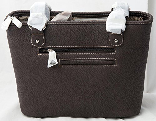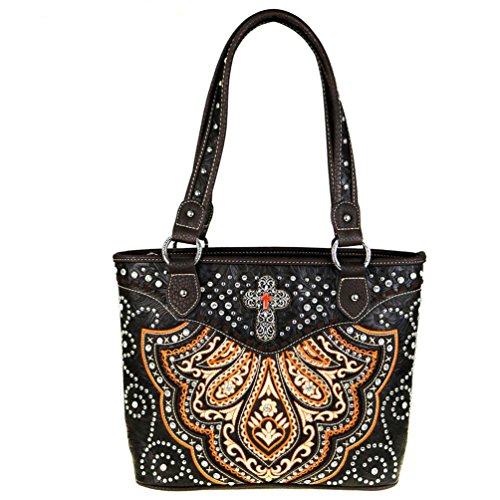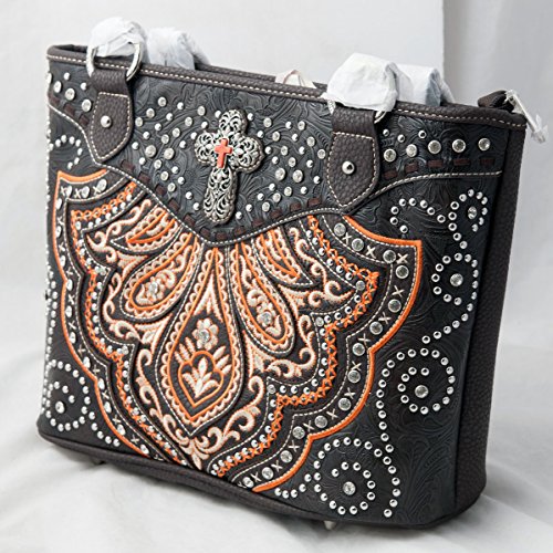 Made of PU/imitation coffee leather, this tote bag has: A silvertone cross decorated with matching color imitation stone cross, tooled background and embroidered pattern accented with silvertone and crystal studs