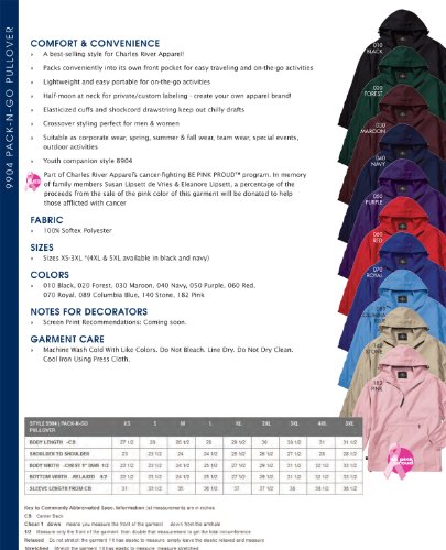Studio : Charles River Apparel Publisher : Charles River Apparel Binding : Apparel Product Description A great packable windbreaker pullover from Charles River Apparel. Lightweight and unlined, this pullover quickly and easily packs into its front pouch pocket and zippers closed. Great for your golf bag, a jacket to travel with or an emergency jacket for your car. Wind and water-resistant. Elasticized cuffs. Adjustable shock cord drawstring at the hem helps seal out wind and rain. Front pockets. A portion of sales from the pink color in this style (pink color 182) go toward Charles River Apparel's charitable be pink proud program supporting cancer-related initiatives. Visit www.bepinkproud.com for more details. When looking for quality apparel, look to Charles River Apparel. Charles River Apparel infuses their clothing with technology, performance, and contemporary style. Traditional new England value brings innovation to everything they make: innovation in how it fits, to the way it feels. Charles River Apparel offers function that performs and fashion that lasts. After more than 30 years of leading quality, the family-owned business pushes into the future with their eyes on the horizon of innovation. " Look good. Feel good. Charles River Apparel." 0