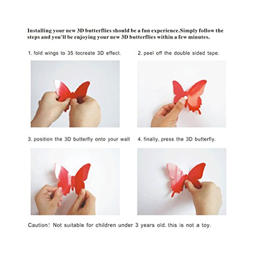 -. Feature : Material: PVC waterproof / Packge: 12pcs(small: 8 pcs, medium: 2 pcs, large: 2 pcs) Include tape. / Size(width): S-2.56",M-3.15", L-4.33". / Easy to stick - apply to dry, clean and smooth surfaces; clean the place you want to stick the butterfly, just peel the paper on the butterfly, paste them, and make sure their wings lift up. / Good decoration gadgets - they can be applied to decor a theme party, butterfly museum embellishment, children room, garden parties, photography background, Christmas, wedding, birthday, etc.