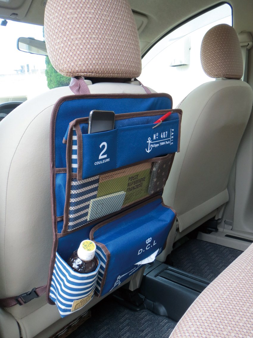At the bottom, there is a drink holder that contains a milk bottle and a plastic bottle, a tissue box holder, and a hook for garbage bag