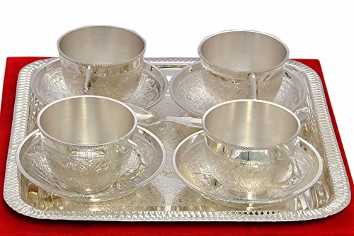 -. Brand : The German Silver Company -. Color : Silver -. EAN : 0636947255281 -. Feature : 4 cups with saucers and a matching serving tray, all in German Silver / Beautiful carvings add a touch of class / Perfect for serving tea or coffee / Royal and aristocratic appeal -. PackageQuantity : 4 -. ProductGroup : Kitchen -. ProductTypeName : KITCHEN -. Title : German Silver Tea/Coffee Cup and Saucer with Tray -. UPC : 636947255281