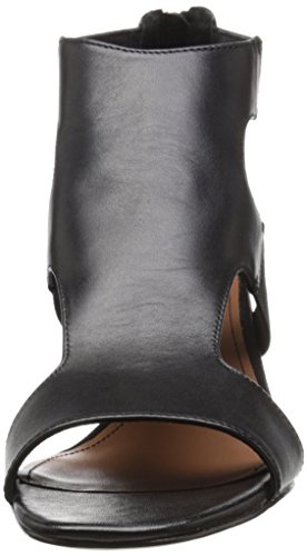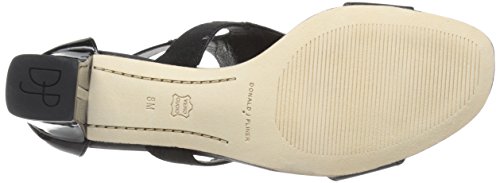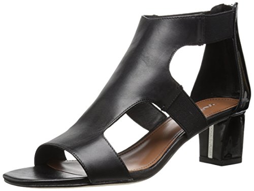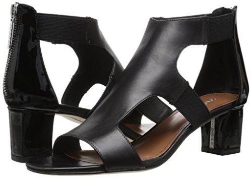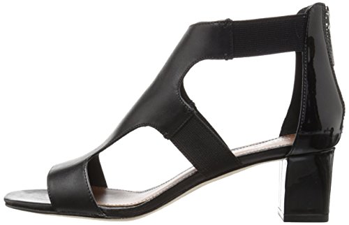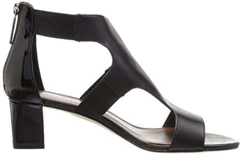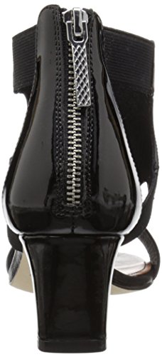 Calfskin upper with patent leather back quarter and basic elastic straps . 2 inch block heel wrapped in patent leather. Leather outsole with rubber pod insert.Feature