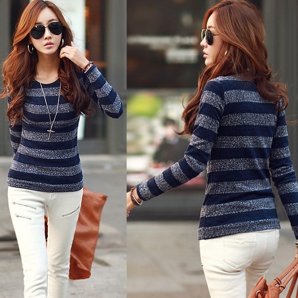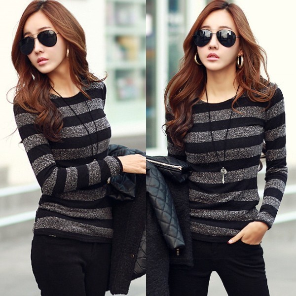 | 商品名 | ミックスカラー 太ボーダー柄 ラウンドネック 長袖トップス Tシャツ ニットソー |