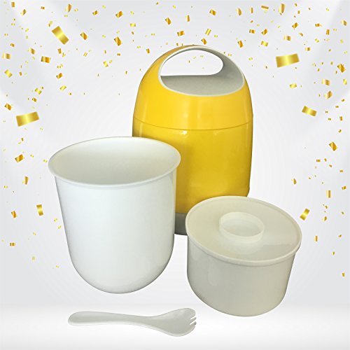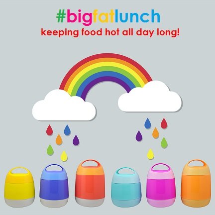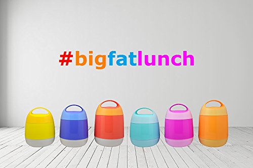 #bigfatlunch has a durable plastic outer shell with an easy-to-open wide handle. It comes with a spoon and a fork which can be snapped into place inside the lid. The inside liner is made of double wall stainless steel vacuum insulation, which is able to keep food hot or cold for 8 hours. #bigfatlunch works best when the compartments are full, and when the thermos has been pre-warmed with hot water. The food should be piping hot when placed in the bowls, and the lid securely closed (unless you are using it for cold food). It comes with two compartments which hold 1.2 Liters of food combined. It is made of BPA free plastic and is FDA approved. The bowls are microwave and dishwasher safe. #bigfatlunch has been tested and loved by kids and parents alike, however it is NOT just for kids!Feature