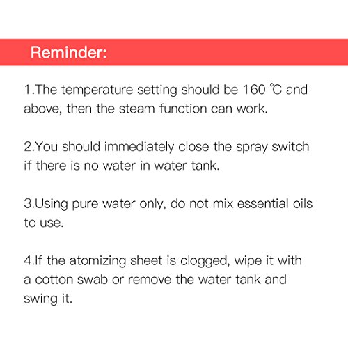 Separate Steam Switch: you can select spray or no spray effect by opening or closing the switch. Need 2-3 minutes to heat up before using steam. And the temperature setting should be 160 ℃ and above, then steam function can work.