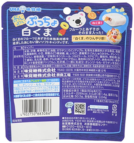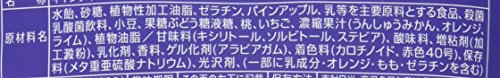 原材料:水飴、砂糖、植物性加工油脂、ゼラチン、パインアップル、乳等を主要原料とする食品、殺菌乳酸菌飲料、小豆、果糖ぶどう糖液糖、桃、いちご、濃縮果汁(うんしゅうみかん、オレンジ、ライム)、植物油脂/甘味料(キシリトール、ソルビトール、ステビア)、酸味料、増粘剤(加工澱粉)、乳化剤、香料、ゲル化剤(アラビアガム)、着色料(カロチノイド、赤色40号)、保存料(メタ重亜硫酸ナトリウム)、光沢剤、(一部に乳成分・オレンジ・もも・ゼラチンを含む)