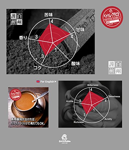 fin 카페(베트남식 필터)에서의 추출을 예상 하고, 극심에 로스트.본고장 베트남의 맛을 충실하게 재현했습니다.물론 전용의드리퍼가 없으면,보통 페이퍼 drip에서도 OK.condense 밀크와 맞추고, 쵸코렛 감각으로 부디.