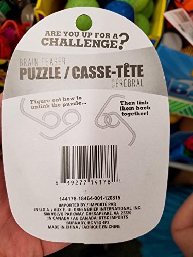 Studio : Greenbrier International, Inc. Publisher : Greenbrier International, Inc. Binding : Toy Product Description 2 metal puzzle parts linked together to be unlinked they can have curves and twists, but you figure them out then put them back together. 0