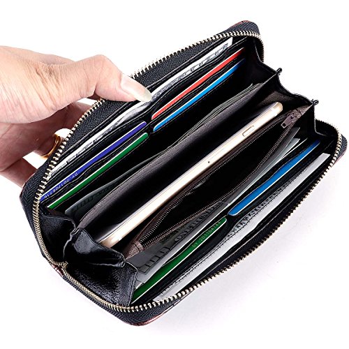- Large Capacity: 8 card slots, 2 long pocket, 1 inside zipper pocket and 2 bill compartment rooms. Can even use as a cell phone case, size of iPhone 7/8 plus, iPhone X and Galaxy S9 etc.