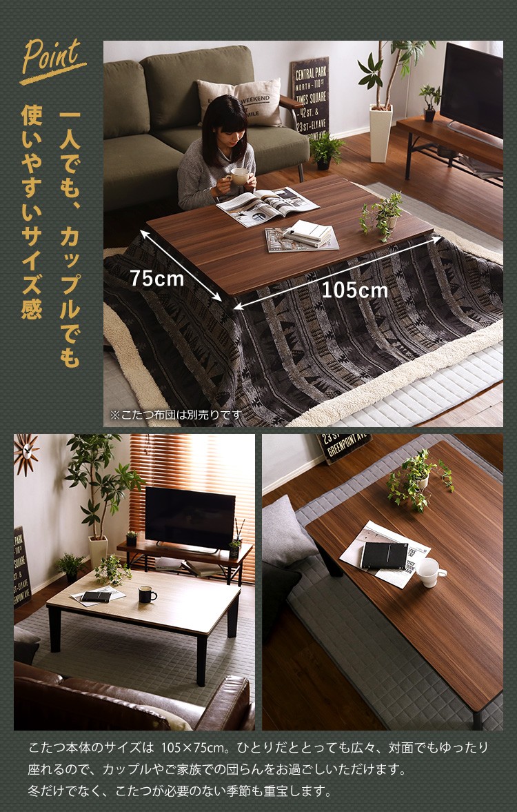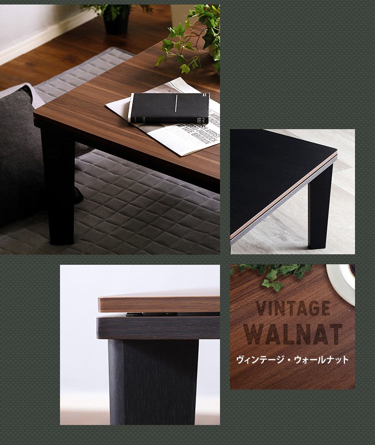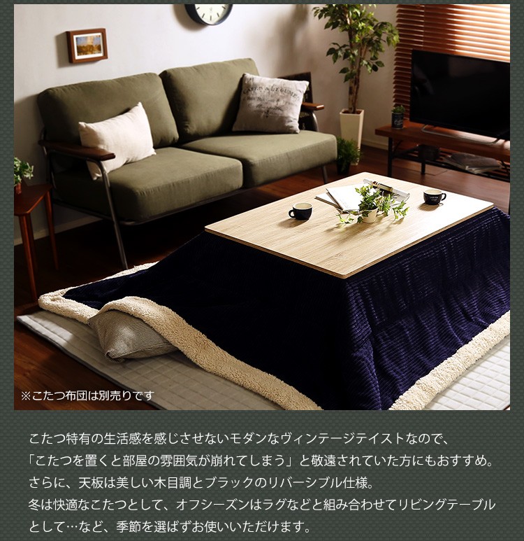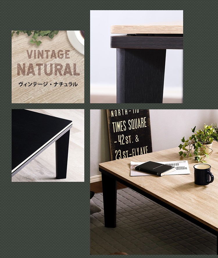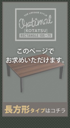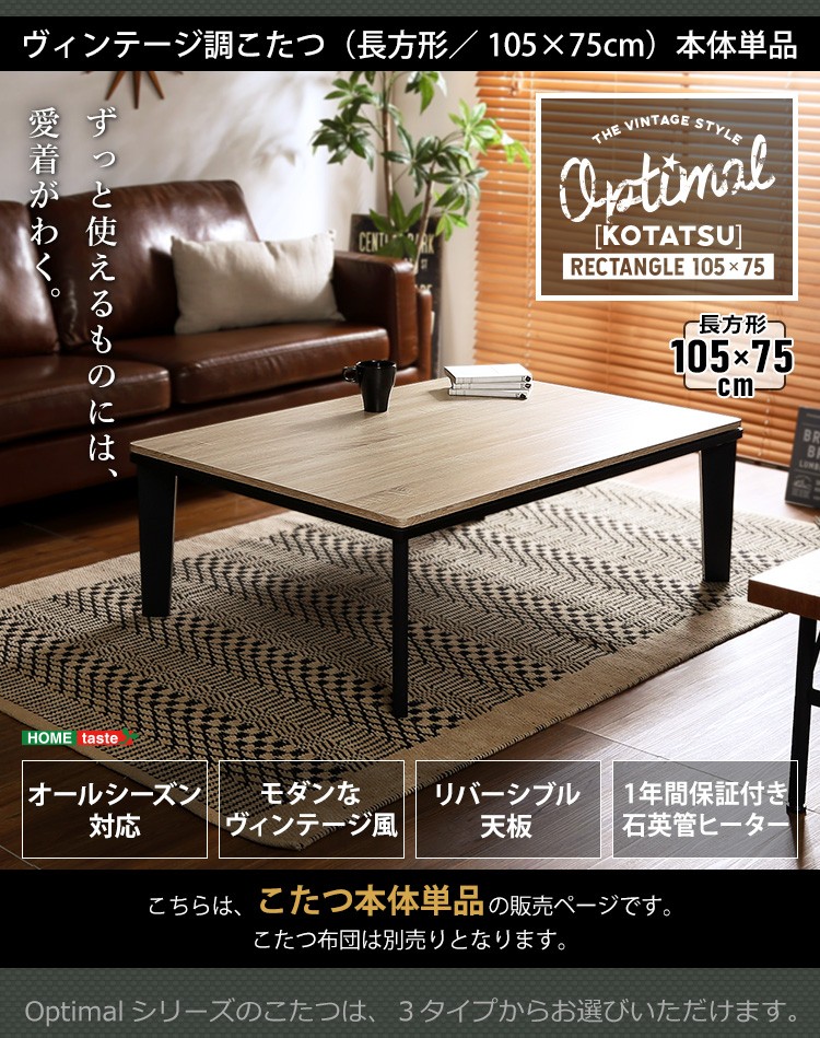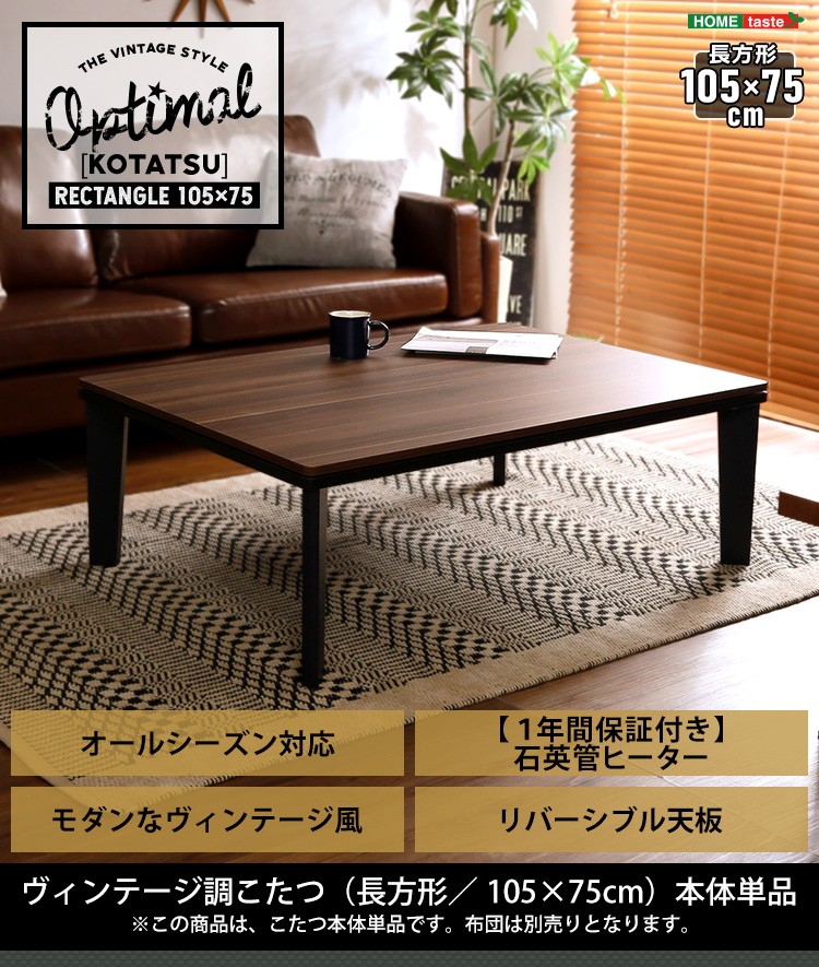 【商品について】カジュアルこたつ ヴィンテージタイプ 石英管ヒーター付 105cm×75cm幅 長方形テーブル本体単品【OPTIMAL -オプティマル-】シリーズ [RECTANGLE 105×75]■サイズ:本体外寸:(約)105x75x36cm本体:(約)15.5kg■カラー:ヴィンテージ/ウォールナットヴィンテージ/ナチュラル■素材:天板:パーチクルボード、PVCシート脚:MDF、PVCシート※付属品:300Wヒーター(メトロ電気工業株式会社製)・無段階温度調節機能、温度ヒューズ付・スイッチ付き電源コード■その他:・完成品でお届けします。※脚はお客様取付け【梱包サイズ】108x78.5x12.6cm【梱包重量】:(約)18kg【商品名】カジュアルこたつ ヴィンテージタイプ 石英管ヒーター付 105cm×75cm幅 長方形テーブル本体単品【OPTIMAL -オプティマル-】シリーズ [RECTANGLE 105×75]