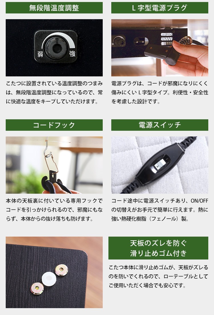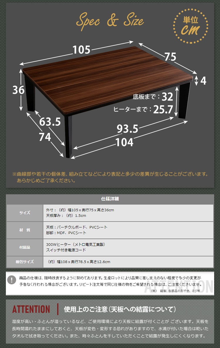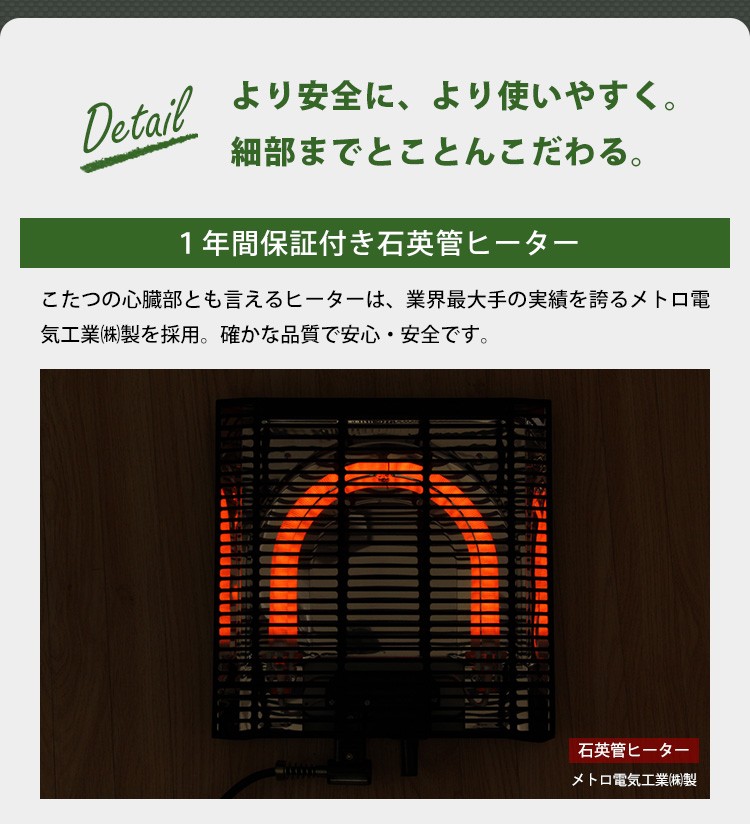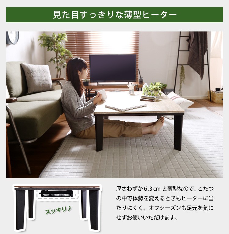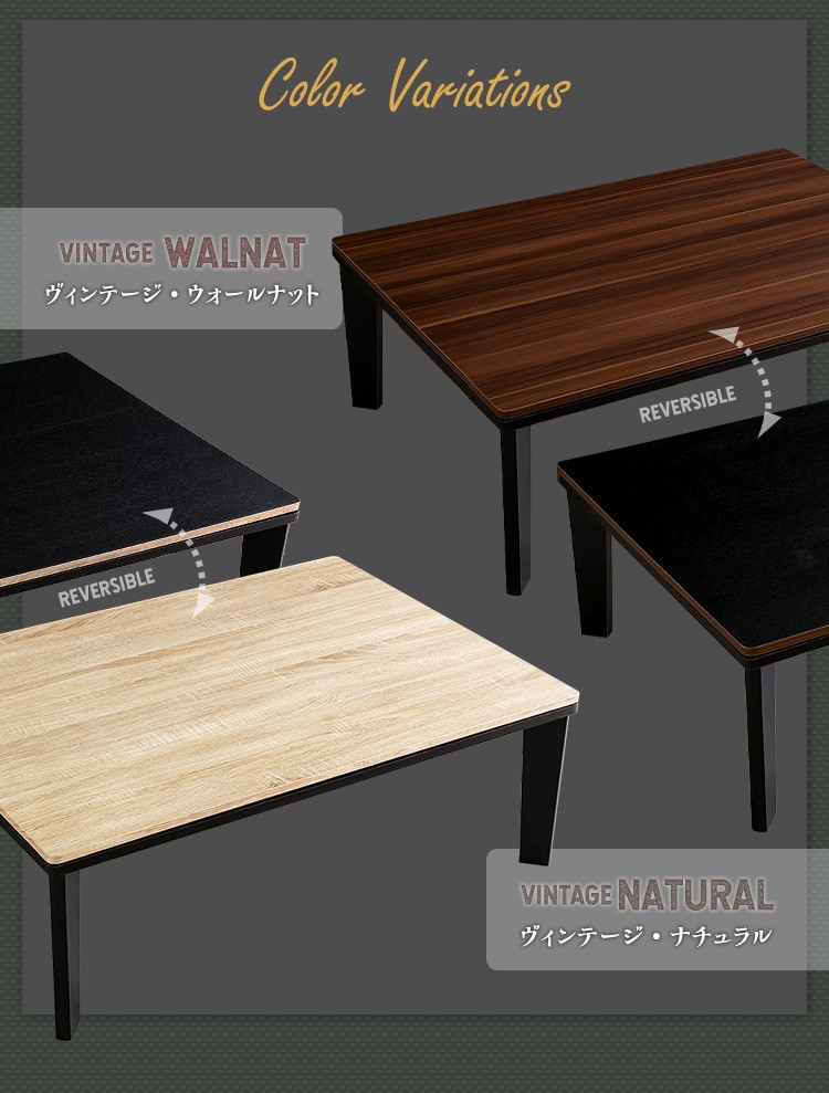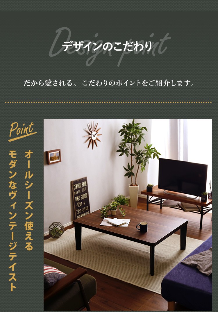 【商品について】カジュアルこたつ ヴィンテージタイプ 石英管ヒーター付 105cm×75cm幅 長方形テーブル本体単品【OPTIMAL -オプティマル-】シリーズ [RECTANGLE 105×75]■サイズ:本体外寸:(約)105x75x36cm本体:(約)15.5kg■カラー:ヴィンテージ/ウォールナットヴィンテージ/ナチュラル■素材:天板:パーチクルボード、PVCシート脚:MDF、PVCシート※付属品:300Wヒーター(メトロ電気工業株式会社製)・無段階温度調節機能、温度ヒューズ付・スイッチ付き電源コード■その他:・完成品でお届けします。※脚はお客様取付け【梱包サイズ】108x78.5x12.6cm【梱包重量】:(約)18kg【商品名】カジュアルこたつ ヴィンテージタイプ 石英管ヒーター付 105cm×75cm幅 長方形テーブル本体単品【OPTIMAL -オプティマル-】シリーズ [RECTANGLE 105×75]