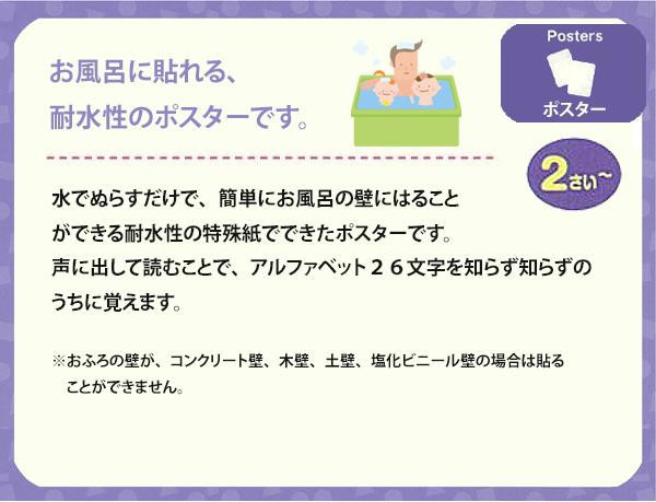 水でぬらすだけで、簡単にお風呂の壁にはることができます。声に出して読むことで、アルファベット26文字を知らず知らずのうちに覚えます。
