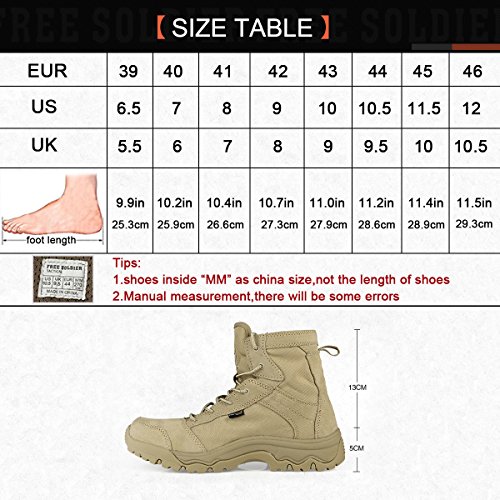 Studio : FREE SOLDIER OUTDOOR PRODUCTS LLC. Publisher : FREE SOLDIER OUTDOOR PRODUCTS LLC. Product Description FREE SOLDIER Men Lightweight Tactical Boots. Single layer of nylon upper is performance breathable,anti-tear,anti-wear,anti-scratched,protect your feet in the jungle well. Insoles and EVA midsole in the bottom for double shock-absorbing,give you more comfortable feeling. Cow suede uppers,make shoes more soft and durable. Non-slip wear-resistant rubber outsole,make you adapt to a variety of outdoor activities better
