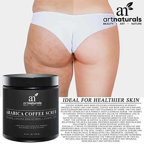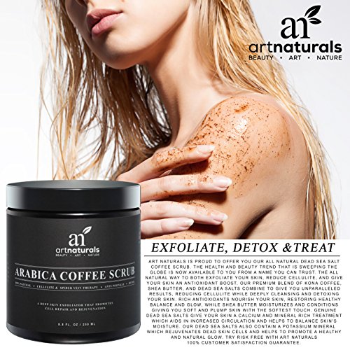 - Feature : ARTNATURALS DEAD SEA SALT & COFFEE BODY SCRUB, 100% SATISFACTION GUARANTEED: Your satisfaction is what drives us to provide the highest quality all natural and organic health and beauty products on the market. If at any time you are not completely satisfied with your purchase feel free to return it to us for a full and prompt refund. At ArtNaturals we are committed to the fair and honest treatment of our global growers and partners. This is why our Dead Sea Salt Coffee Scrub is certified fair trade. This level of dignity and respect stretches beyond our workforce to include all of nature. We stand committed to the production of paraben free and cruelty free goods. Building relationships of trust with those committed to an organic and natural lifestyle is what we do, if at any time you have questions or ideas about how we can serve you better, we would love to hear from you. / DEAD SEA SALT COFFEE SCRUB; EXFOLIATE, DETOX, AND TREAT CELLULITE NATURALLY: Artnaturals is proud to offer you our All Natural Dead Sea Salt Coffee Scrub. The health and beauty trend that is sweeping the globe is now available to you from a name you can trust. The All Natural way to both exfoliate your skin, reduce cellulite, and give your skin an antioxidant boost is here. Our premium blend of Kona Coffee, Shea Butter, and Dead Sea Salts combine to give you unparalleled results, reducing cellulite while deeply cleansing and detoxing your skin. Rich antioxidants nourish your skin restoring healthy balance and glow, while shea butter moisturizes and conditions giving you soft and plump skin with the softest touch. Genuine Dead Sea Salts give your skin a calcium and mineral rich treatment which aids in increased circulation and helps to balance skin's moisture. Our Dead Sea Salts also contain a potassium mineral which rejuvenates dead skin cells and helps to promote a healthy and natural glow. Try Risk free with ArtNaturals 100% Customer Satisfaction Guarantee. / WHY COFFEE SCRUB FOR MY SKIN?: Coffee Scrubs have been enjoying a renaissance as beauty products these last few years. The truth is that Coffee has been used as a natural skin cleanser and exfoliant for thousands of years. The fine grit in coffee grinds act as a perfect deep cleansing scrub but the secret to coffees effectiveness as an anti cellulite treatment lies in caffeine. Though often associated in a negative light, caffeine actually has a host of amazing benefits for your skin. First the caffeine in coffee is a rich source of antioxidants, bolstering the skin's natural defenses against free radicals and pollutants. Secondly when caffeine is applied topically it helps to enhance circulation leading to healthy and energised skin, effectively reducing the swelling of tissues and depuffing areas of the skin. Thirdly caffeine in coffee scrubs can play a crucial role in regulating cell regrowth, leading to retained hydration, increased collagen production and increased skin elasticity. Start enjoying the timeless benefits of this all natural and vegan solution to skin care with ArtNaturals Dead Sea Salt and Coffee Scrub. / EXFOLIATION AND DEEP CLEANSING REGARDLESS OF SKIN TYPE: Our Dead Sea Salt Coffee Scrub is easy to apply regardless of your skin type. Simply dollop a healthy portion of scrub into hands and using circular motions massage into skin taking care to apply to troubled area of cellulite build up on thighs, arms, legs, and bottom. Because coffee and salts are coarse and fine it is best to apply scrub while in the shower with the water turned off. This will allow you to treat your whole body while avoiding unwanted mess. Once scrub has been massaged into skin allow 3 to 5 minutes before rinsing thoroughly. Application is recommended before bed as your skin will appear red for the a short period after use. Use daily or as recommended by your dermatologist. / THE HIGHEST STANDARDS OF EXCELLENCE: At ArtNatural we are committed to the use of 100 percent all natural ingredients. We understand that you place trust in us, to provide you with safe, healthy and ethically conscious products. We take that trust seriously and are committed to products that meet the highest standards of excellence. Our Dead Sea Salt Coffee Scrub is certified fair trade and comes to you with the promise of ethical and fair practices for the skilled labor and global partners that proudly contribute to our products. All our products are all natural and meet the highest levels of consumer safety and transparency. Our ingredients are always clearly labeled and 100% thorough and truthful. Our love of beauty stretches beyond humanity and strives to see the wonder in all of nature. That is why our packaging is made with recycled materials and our ingredients vegan certified, paraben free and cruelty free.