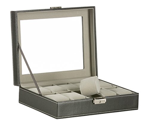 ClosetMate 12 Slot Luxury Watch Case Display Organizer Black PU Leather, Fully Lined With Soft Grey Lining, Lock and key