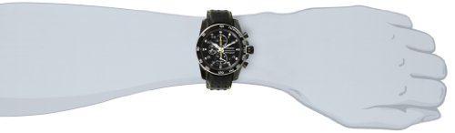 -. Feature : Round watch in stainless-steel with black dial, tachymeter bezel, and perforated leather band with contrast stitching / Japanese quartz movement with analog display / Protective Hardlex crystal dial window / Features buckle closure, chronograph subdials, date window / Water resistant to 330 feet (100 M): suitable for snorkeling, as well as swimming, but not diving