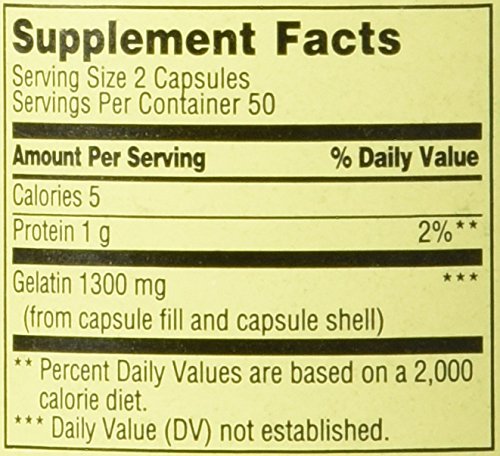 -. Feature : Gelatin is one of the raw materials for collagen, the building block for strong, healthy nails. / As a supplement, Gelatin supports the beauty of your nails. / Gelatin 650 mg Per Capsule. / 1300 mg Per Two Capsules Serving. / 100 Capsules.