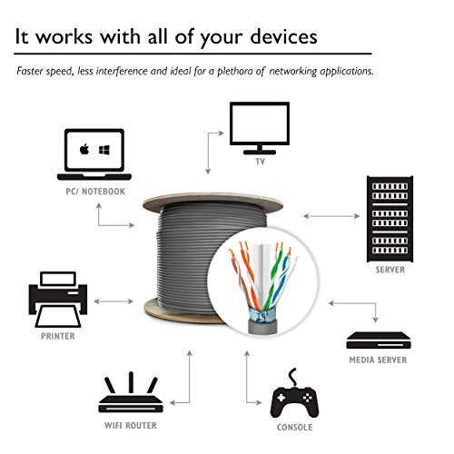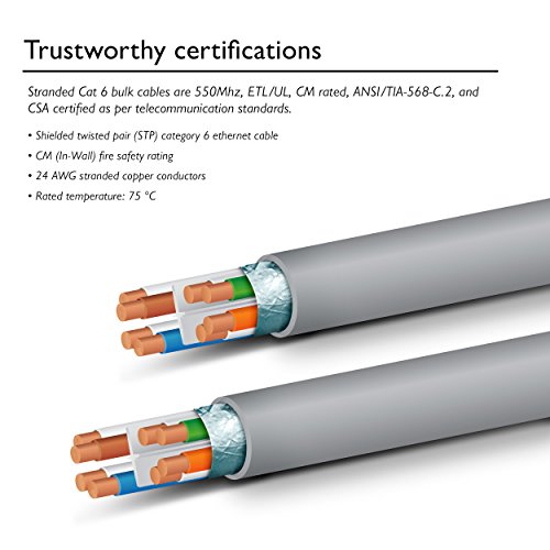 High Performance Cat6, 24 AWG, CM Rated, Ethernet Bulk Cable is an ideal choice for wiring your home or office for high-speed network; STP shielding can prevent electromagnetic interference (EMI) and reduce crosstalk noise