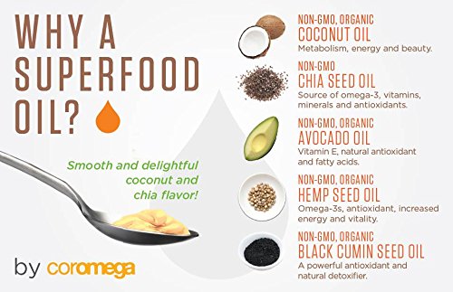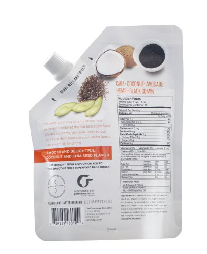 -. Binding : Health and Beauty -. Brand : Coromega -. EAN : 0689269460109 -. Feature : Be Bright is a revolutionary lsified blend of superfood oils created for better absorption superior taste and better health / This is a combination of 5 top superfood oils including chia seed oil and coconut oil as well as avacado oil and h.e.m.p seed oil and black cumin seed oil / This revolutionary blend is rich in Omega-3s and antioxidents / Take this delightful nutrition boost by the spoonful or add it to your favorite smoothie or snack / This delecious blend is non-GMO as well as organic, vegan and gluten free -. IsAdultProduct : 0 -. Label : Coromega -. Manufacturer : Coromega -. MPN : C60109 -. NumberOfItems : 1 -. PackageQuantity : 1 -. PartNumber : C60109 -. ProductGroup : Health and Beauty -. ProductTypeName : HEALTH_PERSONAL_CARE -. PublicationDate : 2014-04-05 -. Publisher : Coromega -. ReleaseDate : 2014-05-01 -. Size : 10.6 -. Studio : Coromega -. Title : Coromega Be Bright Superfood Oil Blend, Coconut Chia, 10.6 Ounce -. UPC : 689269460109