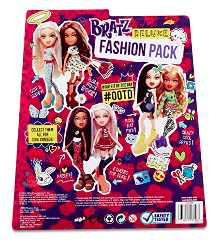 - Feature : Bratz Deluxe Fashion Pack includes two outfits to style two Bratz dolls / Outfits are perfect for Raya and Jade's styles / Mix and match for even more fab fashion combinations! / Style your Bratz doll with brand new fashions! / Collect all 3 Deluxe Fashion Packs