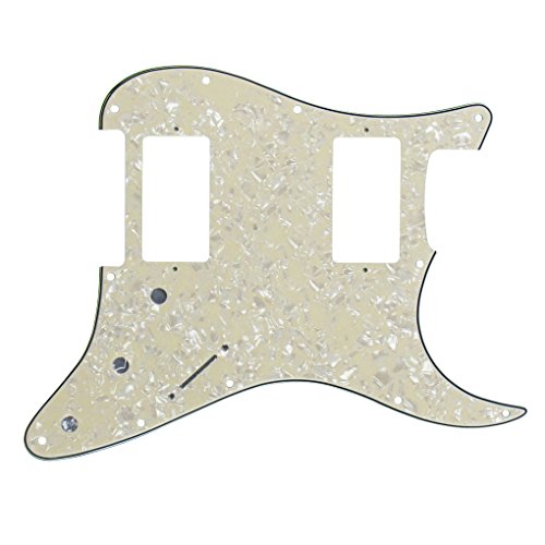 Product Description Specification:Humbucker-Humbucker pickguard, 11 hole standard mounting pattern with counter-sunk mounting screw holes.3 control pot holes pre-drilled in Standard Volume-Tone-Tone Positions (Positions 1, 2, 3).1 standard size switch cut with 2 switch mounting holes (1 each side of switch cut; not counter-sunk).Humbucker hole size: 38mm x 70mmHumbucker screws center/center: 78mmMaterial: Made of 4ply Pearl Plate, with off set screw holes and beveled edge.With pure aluminum foil shielded.Color: Aged PearlWith protective film on the surface, while using please split it off.Note:Item's color might be different from the picture because of the aberration.Package Includes:2 x guitar pickguards50 x mounting screws 0