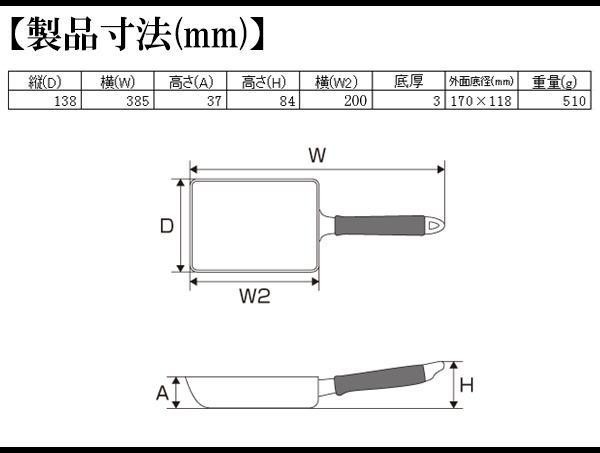 ガス火に最適な玉子焼器。内面は「テフロン(TM)プラチナプラス加工」で料理を美しく仕上げ、汚れもサッと落ちます♪本体は熱伝導の良いアルミニウム合金製。底は3mmの厚さで熱変形に強く、熱ムラのない熱伝導が可能です。 |
