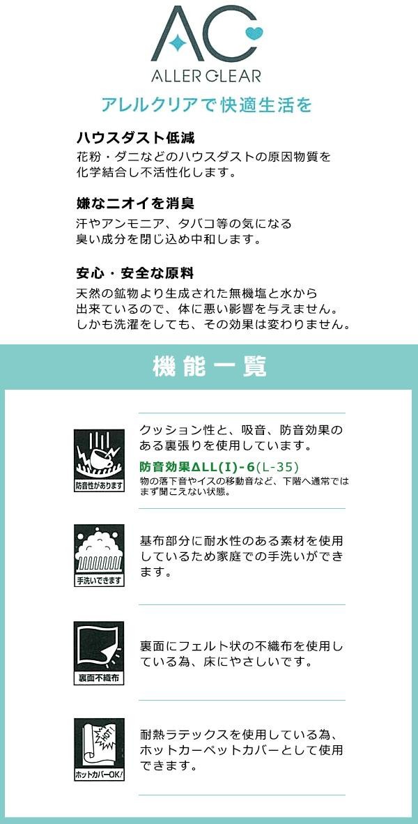ハウスダストを低減させ、嫌なニオイを閉じ込め中和する事が出来るカーペット!!防音効果も兼ね備えています。8mm厚ウレタン使用でクッション性抜群♪ |