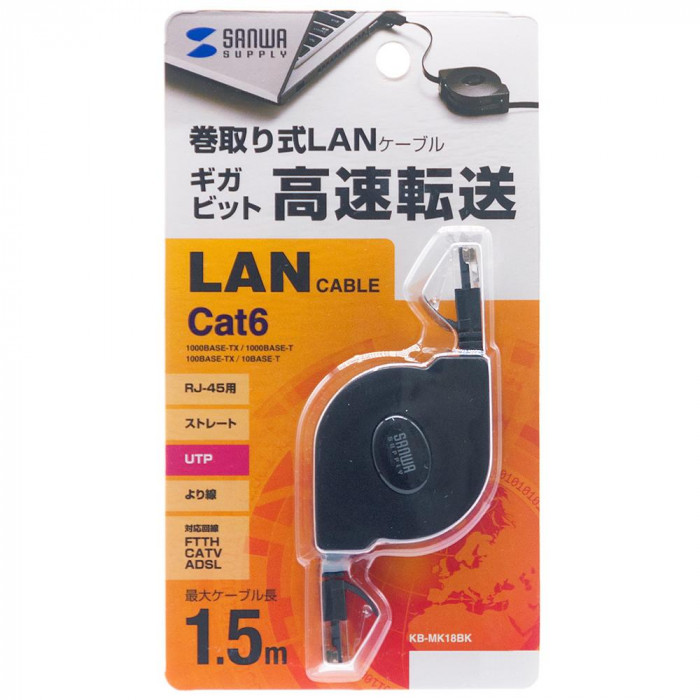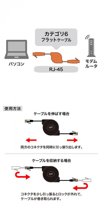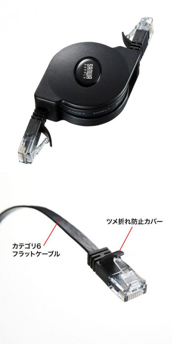 ケーブルを巻取り収納でき、コンパクトで携帯に便利なLANケーブルです。カテゴリ6フラットケーブルを採用しています。ツメ折れ防止カバー付きの両端RJ-45スリムコネクタです。