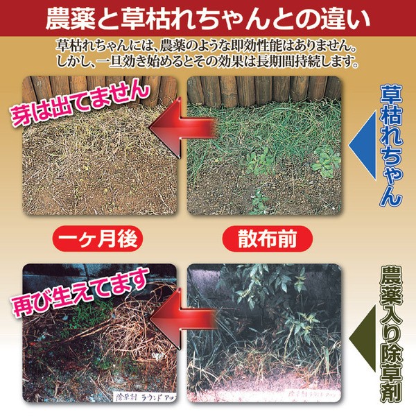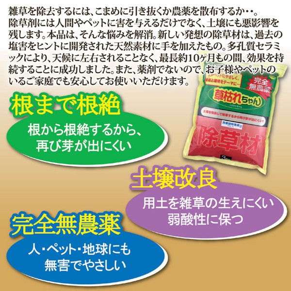 雑草を除去するには、抜くか農薬を散布するか・・。 除草剤には人間やペットに害を与えるだけでなく、土壌にも悪影響を残します。本品は、そんな悩みを解消。新しい発想の除草材は、過去の塩害をヒントに開発された天然素材に手を加えたもの。農薬のように即効性はありませんが、多孔質セラミックにより、天候に左右されることなく、最長約10ヶ月もの間、効果を持続することに成功しました。また、薬剤でないので、お子様やペットのいるご家庭でも安心してお使いいただけます。墓地などの除草にも最適です。草枯れちゃんを使用後の土壌は酸性化しておりますので、再び草花を植える際は、ホームセンター等で販売されている石灰をよく混ぜて中和した状態に戻し、少し時間を置いてから植えてください。