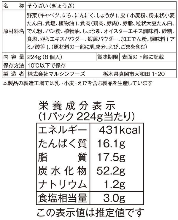 | 原材料 | 名称:そうざい(ぎょうざ) 野菜(キャベツ、にら、にんにく、しょうが)、皮(小麦粉、粉末状小麦たん白、食塩、植物油)、食肉(鶏肉、豚肉)、豚脂、粒状大豆たん白、でん粉、パン粉、植物油、しょうゆ、オイスターエキス調味料、砂糖、食塩、がらエキスパウダー、蝦醤パウダー、加工でん粉、調味料(アミノ酸等)、(原材料の一部に乳成分、えび、ごまを含む) |