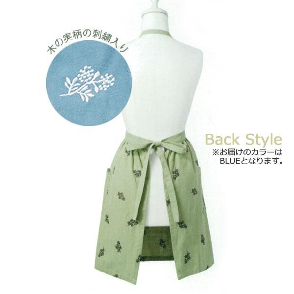 木の実柄の刺繍をあしらったナチュラルなデザインで、可愛らしい雰囲気のエプロンです。