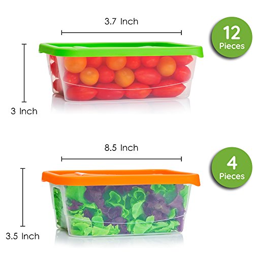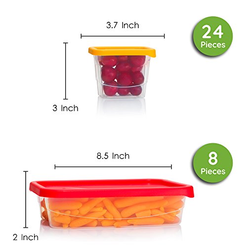 * MORE STORAGE THAN OTHERS: The complete PLAS GLAS CONTAINER SET can hold up to 732 ounces, more than its competitors; the package includes 24 8-ounce, 4 56-ounce, 3 76-ounce, and 2 92-ounce containers with light orange, bright orange, green, and red lids; due to their holding capabilities, they are lower cost per unit than others; 3 sizes have same-sized mix-and-match lids.